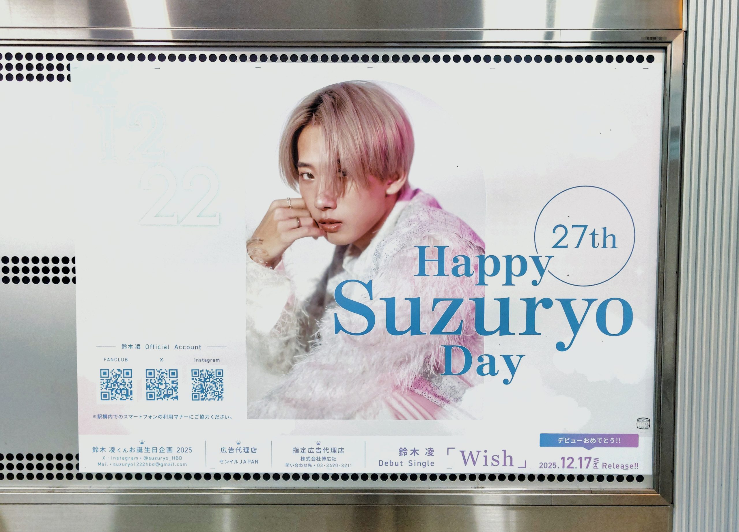 グループ「MADEIN」のメンバーとして活躍する坂本舞白(ましろ)さんの誕生日(12月16日)を祝う応援広告が掲出されていました。