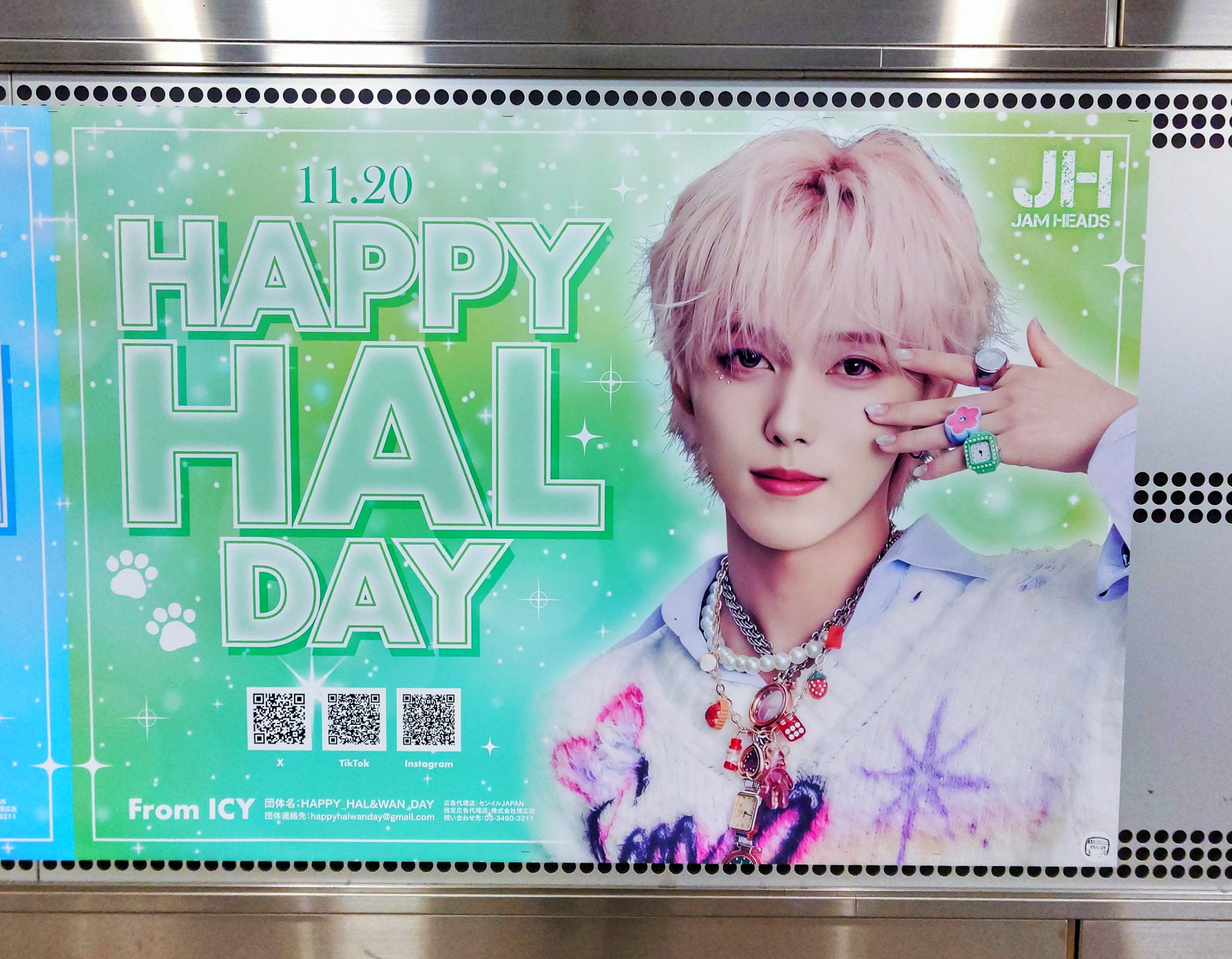 ダンス&ボーカルグループ「JAM HEADS(ジャムヘッズ)」のメンバー、HAL(ハル)さんとWAN(ワン)さんのお誕生日を記念した応援広告(センイル広告)が並んで掲出されていました。